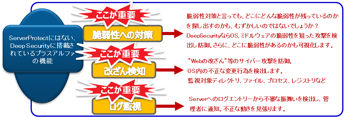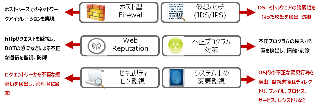 | ②仮想パッチ(IDS/IPS) | 脆弱性を突いた攻撃からサーバを保護します。 |