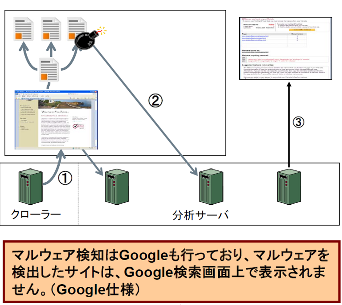 | ② | ダウンロードされたページのサイト情報が分析サーバ内で分析されます。 |