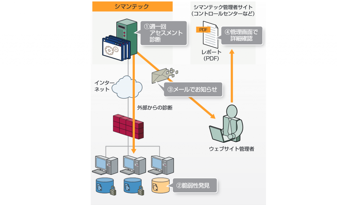 | ー | お客様のウェブサイトに対して、ハッカーの攻撃対象になる脆弱性が存在していないか、シマンテックが外部から検知・レポートいたします。 |